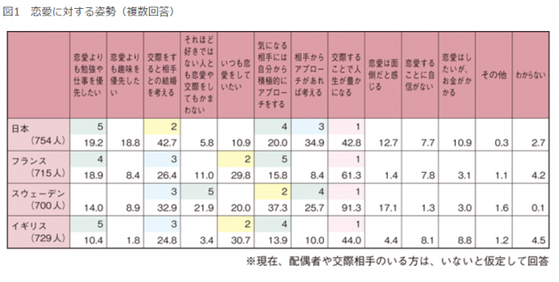 こちらの資料では「交際することで人生が豊かになる」が61.3%で、スウェーデンの91.3%に継ぐ2位。